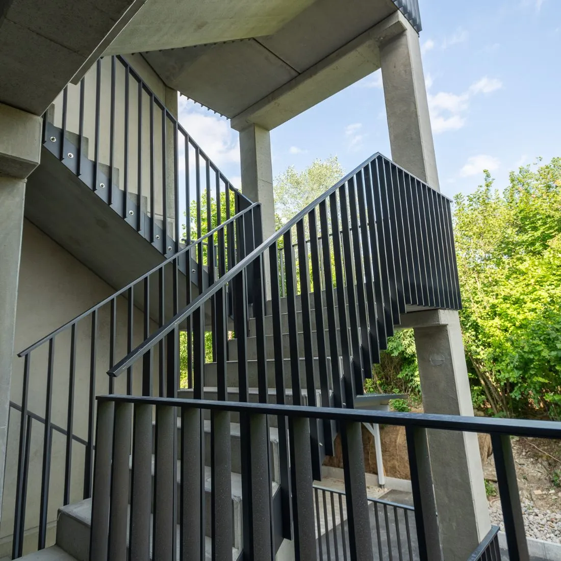 Ob Balkongeländer, Treppenhäuser mit Steigungen – die klare Ästhetik des LAMINA Stabgeländersystems aus Aluminium bietet nicht nur Gestaltungsoptionen in der Form, sondern auch in der Farbe. Die Geländerstäbe, der Handlauf und die Basisprofile mit Verkleidungsblechen können in der ökologischen Pulverbeschichtungsanlage von Abel individuell an die architektonische Gestaltung angepasst werden.